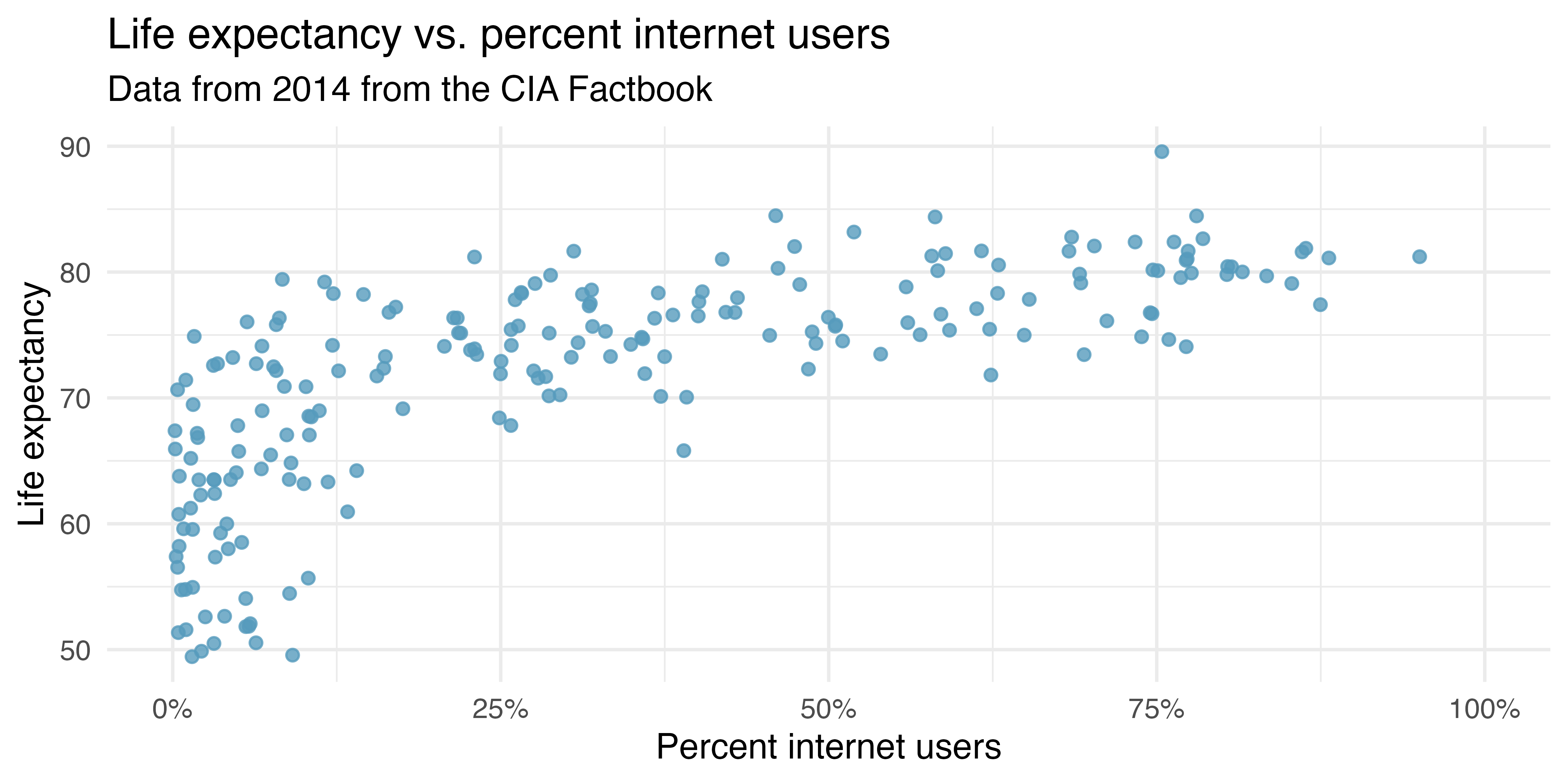 Internet use and life expectancy. The following scatterplot was created as part of a study evaluating the relationship between estimated life expectancy at birth (as of 2014) and percentage of internet users (as of 2009) in 208 countries for which such data were available.12