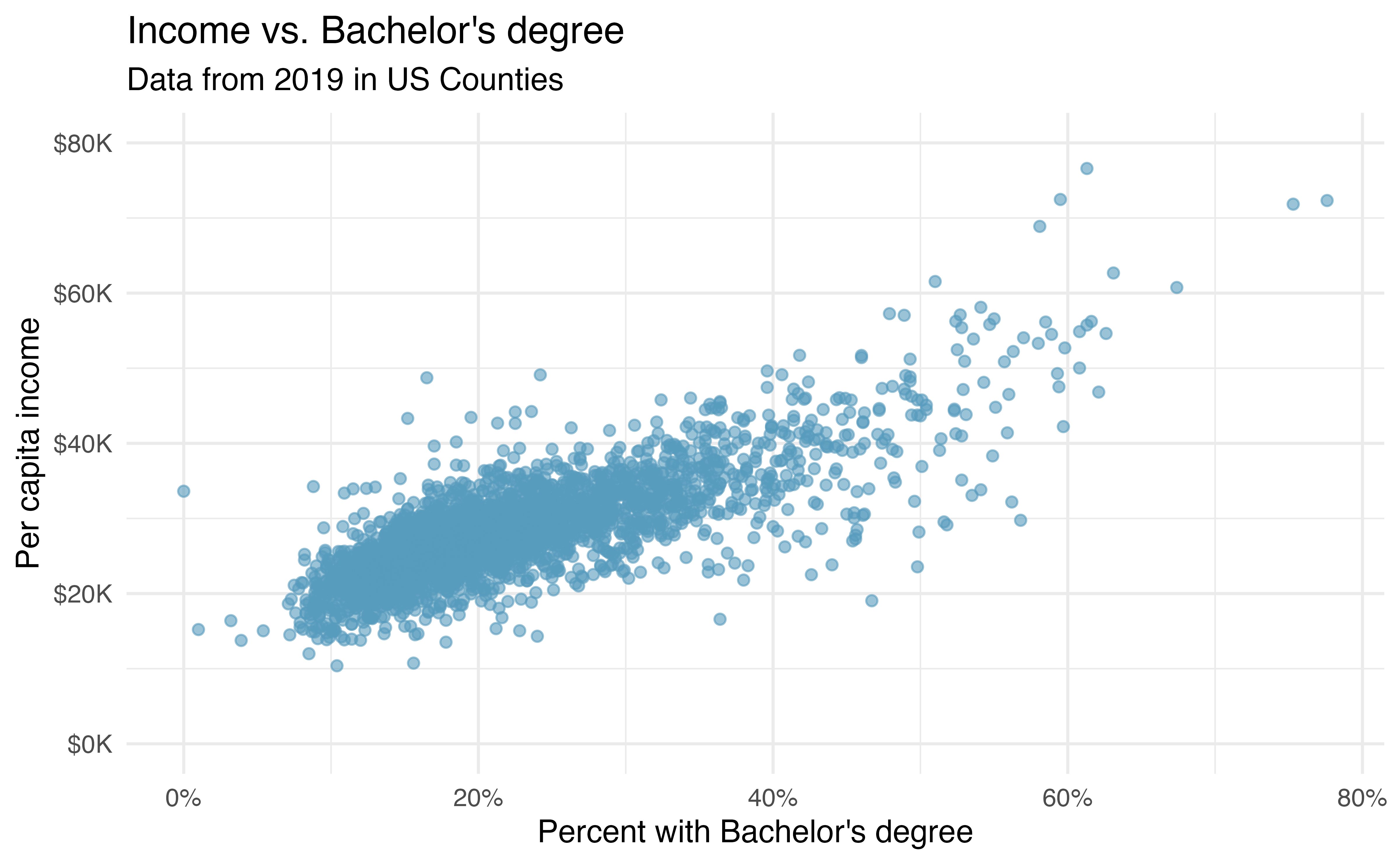 Income and education in US counties. The scatterplot below shows the relationship between per capita income (in thousands of dollars) and percent of population with a bachelor’s degree in 3,142 counties in the US in 2019.13
