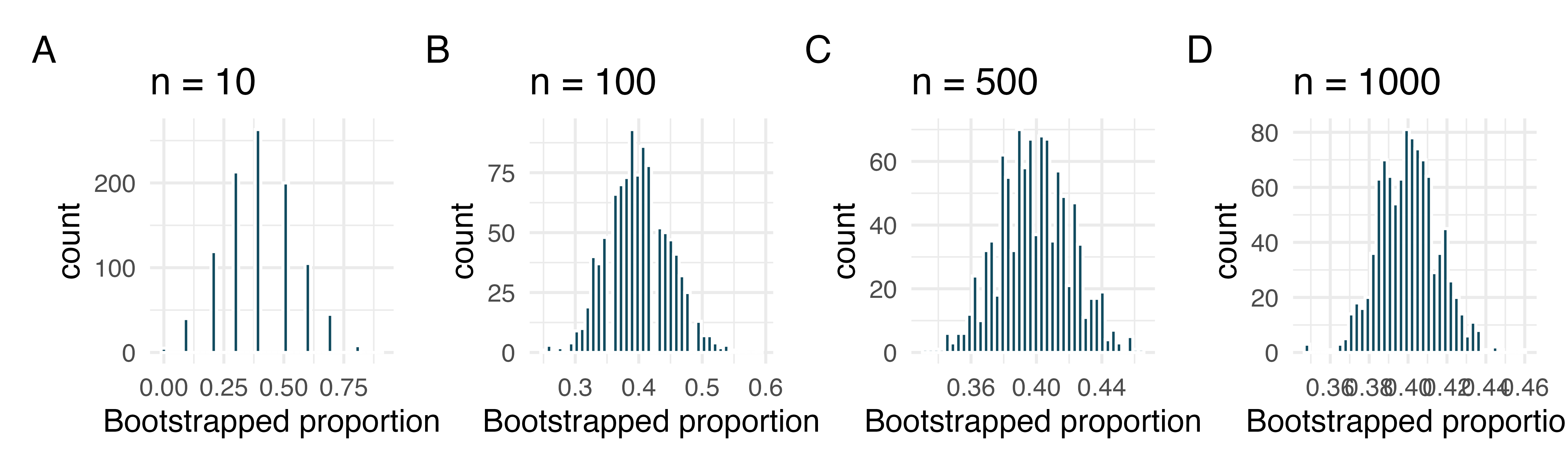 Bootstrap distributions of \(\hat{p}\), III. Each of the following four distributions was created using a different dataset. Each dataset had the same proportion of successes \((\hat{p} = 0.4)\) but a different sample size. The four datasets were given by \(n = 10, 100, 500\), and \(1000\).