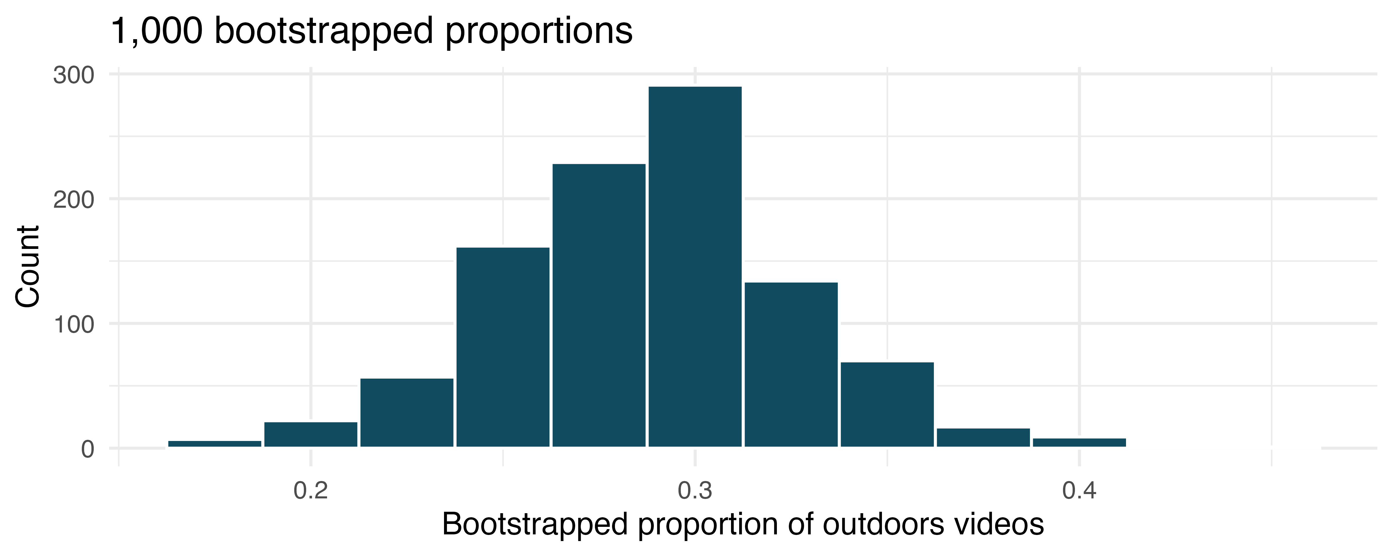 The histogram provides a bootstrap sampling distribution for the sample proportion (with 1000 bootstrap repetitions). Using the histogram, estimate a 90% confidence interval for the proportion of YouTube videos which take place outdoors.