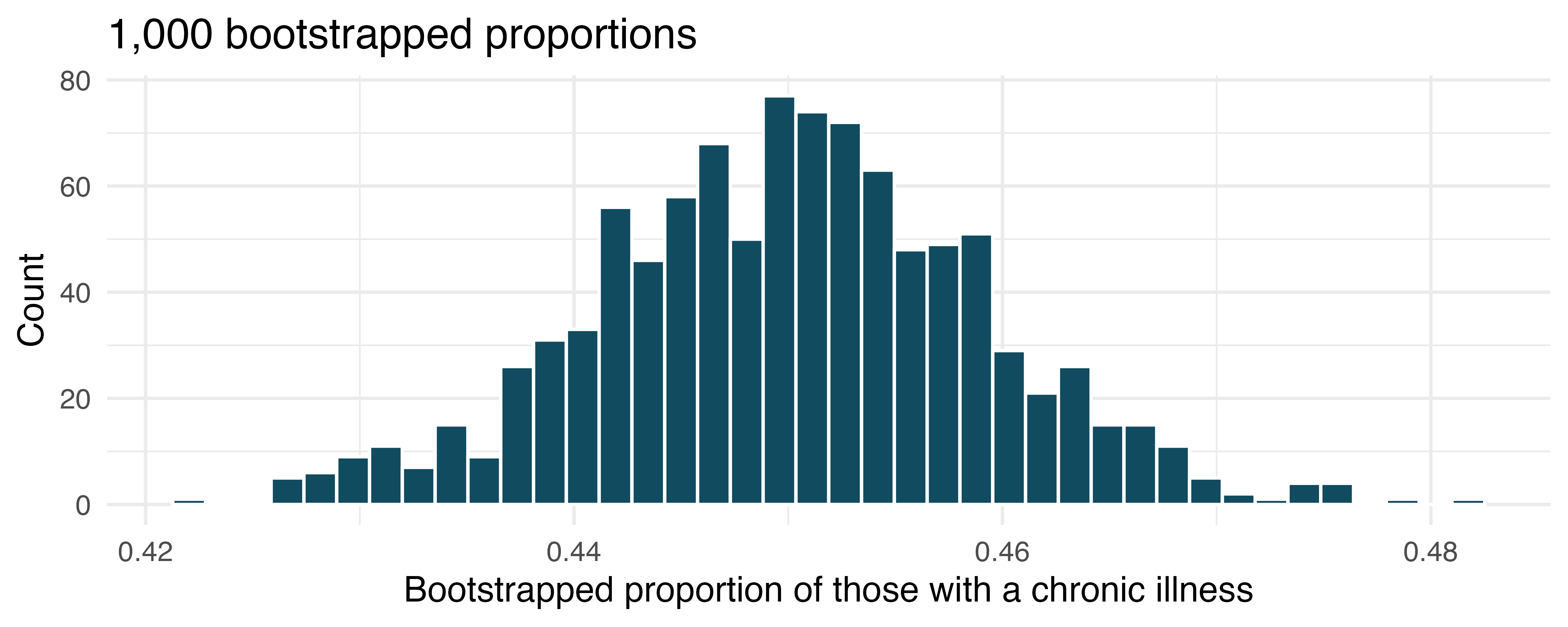 Chronic illness. In 2012 the Pew Research Foundation reported that “45% of US adults report that they live with one or more chronic conditions.” However, this value was based on a sample, so it may not be a perfect estimate for the population parameter of interest on its own. The study was based on a sample of 3014 adults. Below is a distribution of 1000 bootstrapped sample proportions from the Pew dataset. (Pew Research Center 2013) Using the distribution of 1,000 bootstrapped proportions, approximate a 92% confidence interval for the true proportion of US adults who live with one or more chronic conditions and interpret it.