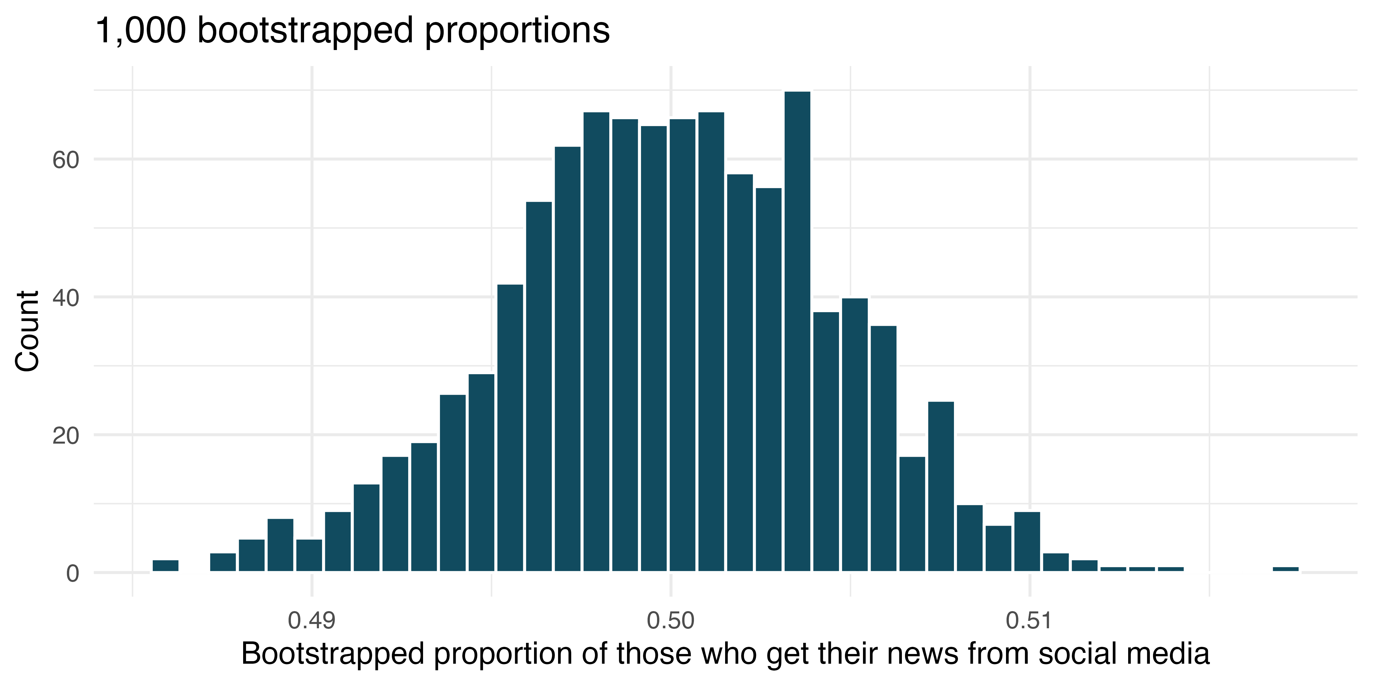 Social media users and news, bootstrapping. A poll conducted in 2022 found that 50% of U.S. adults get news from social media sometimes or often. However, the value was based on a sample, so it may not be a perfect estimate for the population parameter of interest on its own. The study was based on a sample of 12,147 adults. Below is a distribution of 1,000 bootstrapped sample proportions from the Pew dataset. (Pew Research Center 2022) Using the distribution of 1,000 bootstrapped proportions, approximate a 98% confidence interval for the true proportion of US adult social media users (in 2022) who get at least some of their news from Twitter. Interpret the interval in the context of the problem.
