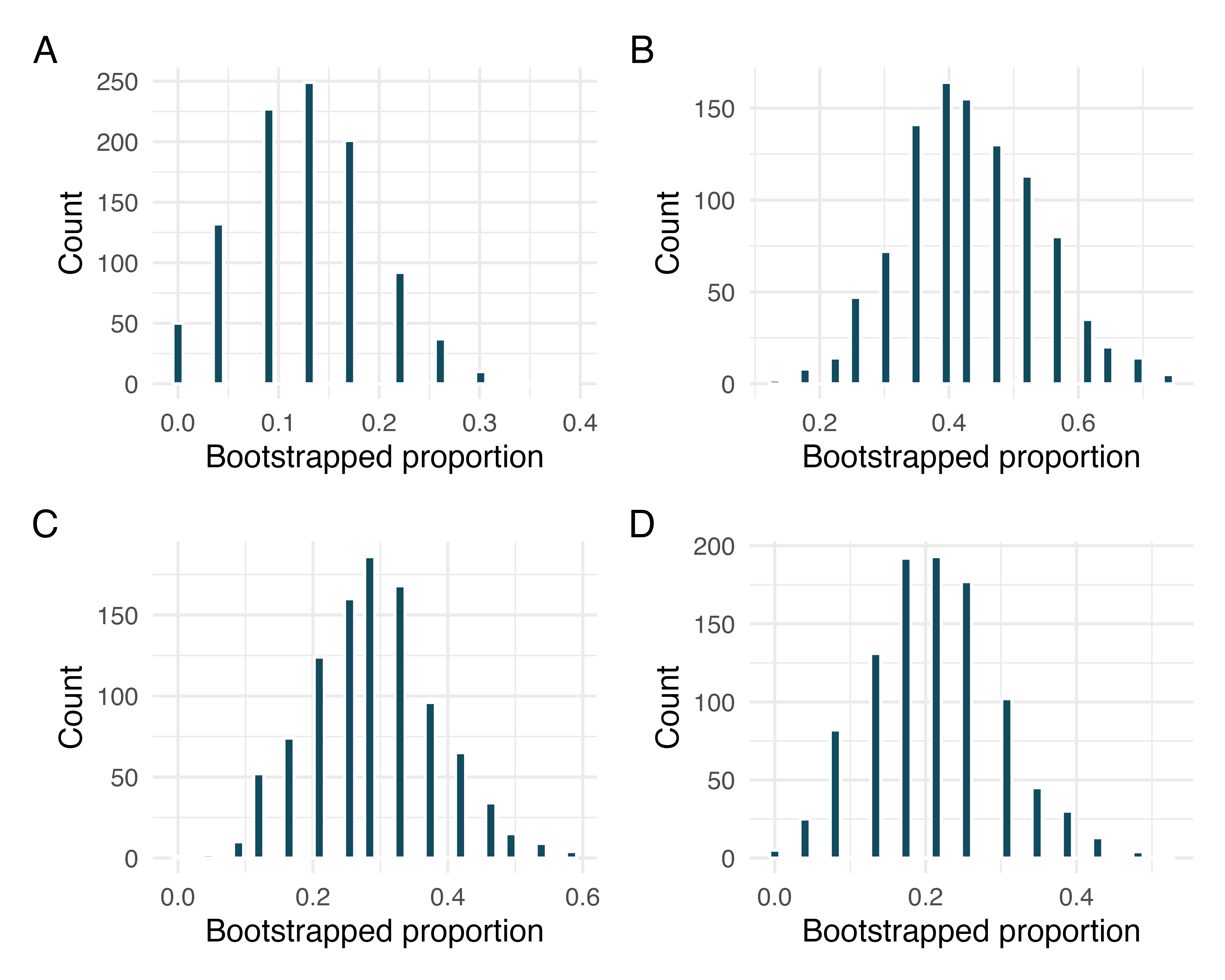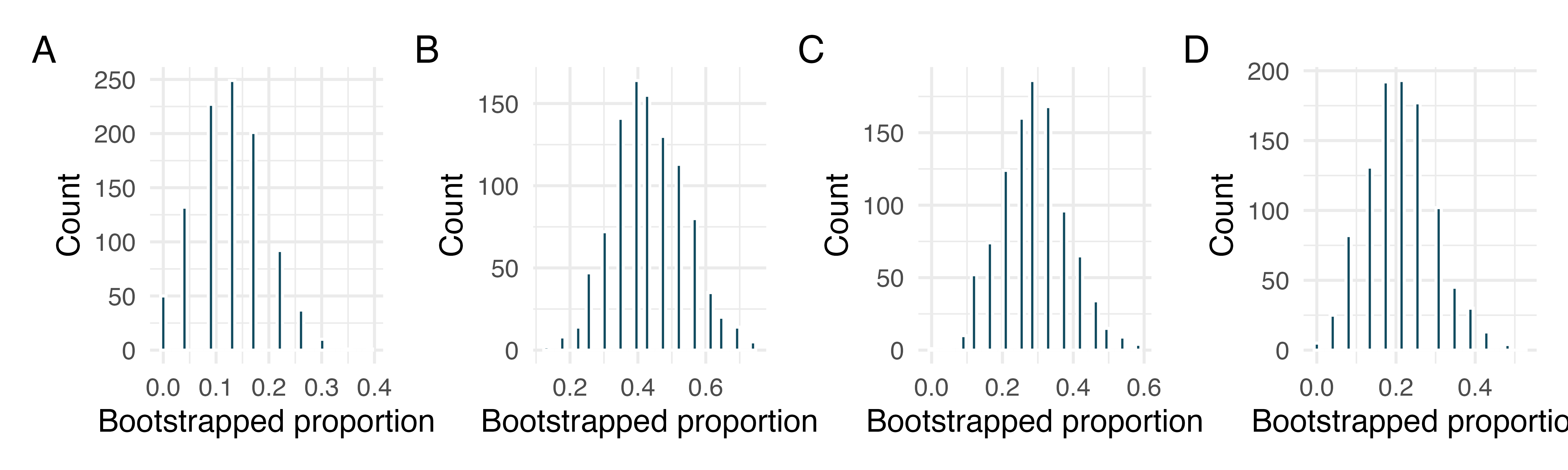 Bootstrap distributions of \(\hat{p}\), II. Each of the following four distributions was created using a different dataset. Each dataset was based on \(n=23\) observations.